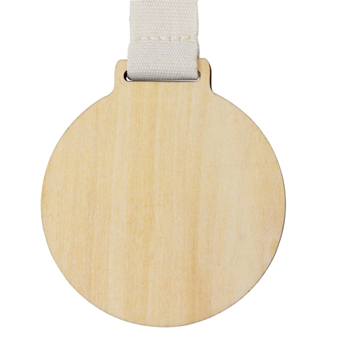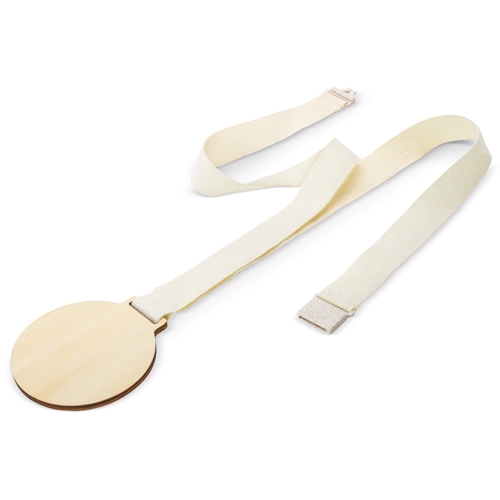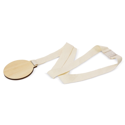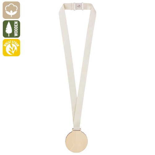 Medalla de madera con cinta de algodón y cierre de seguridad fabricado en fibra de trigo